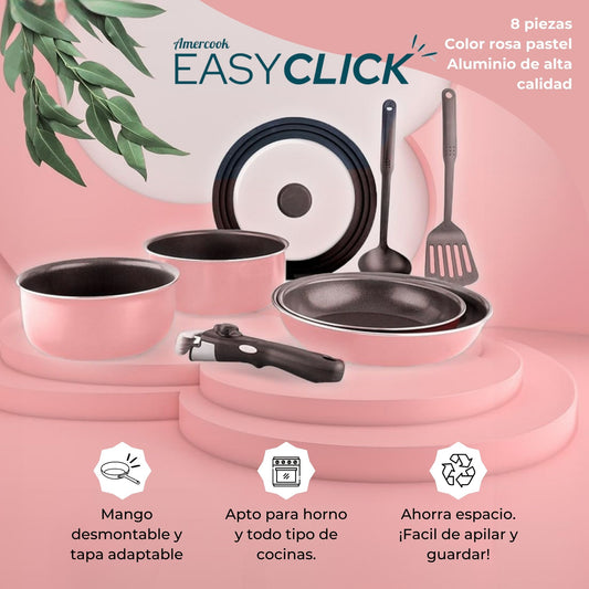 Batería de cocina de aluminio EasyClick de 8 piezas y mango extraíble de color rosa pastel