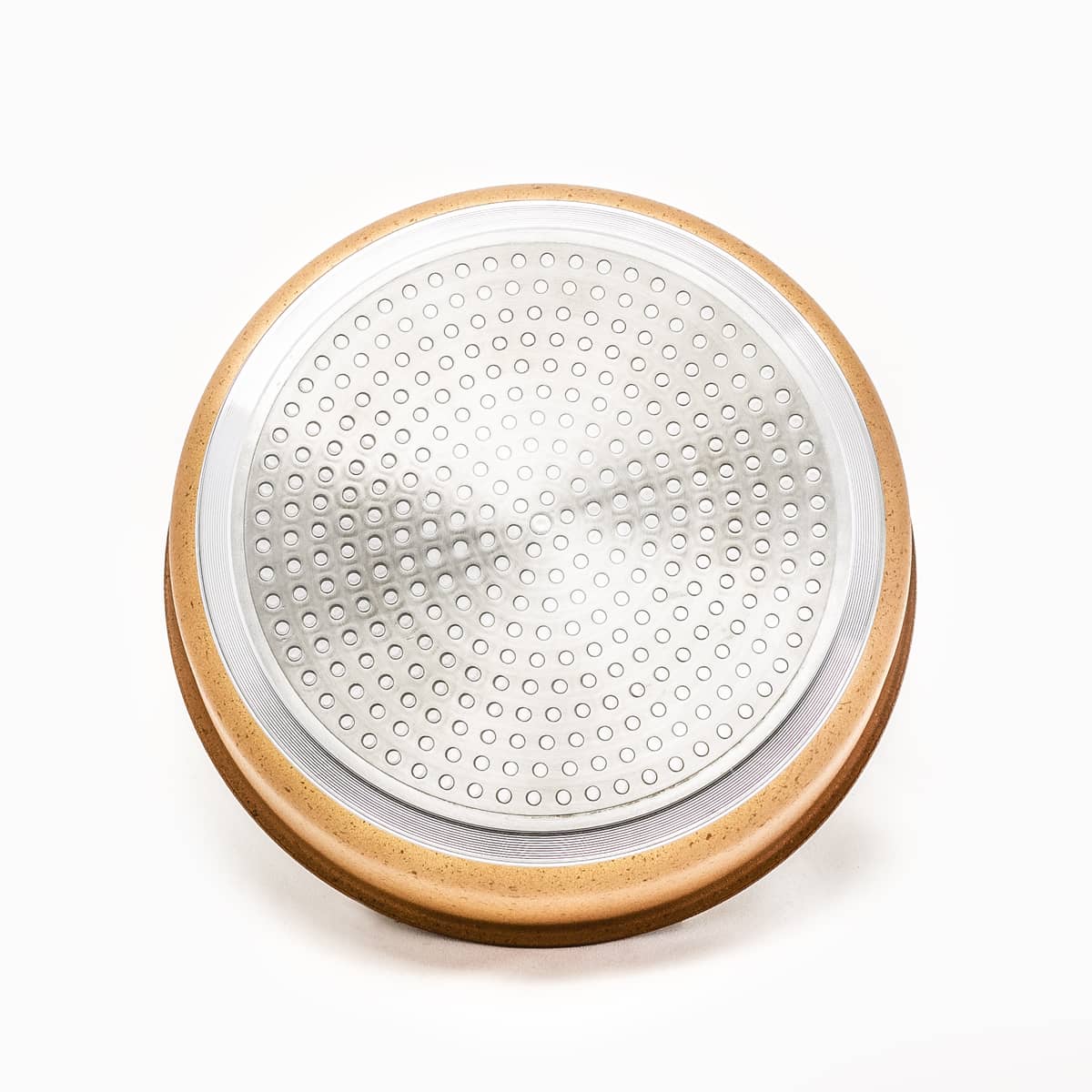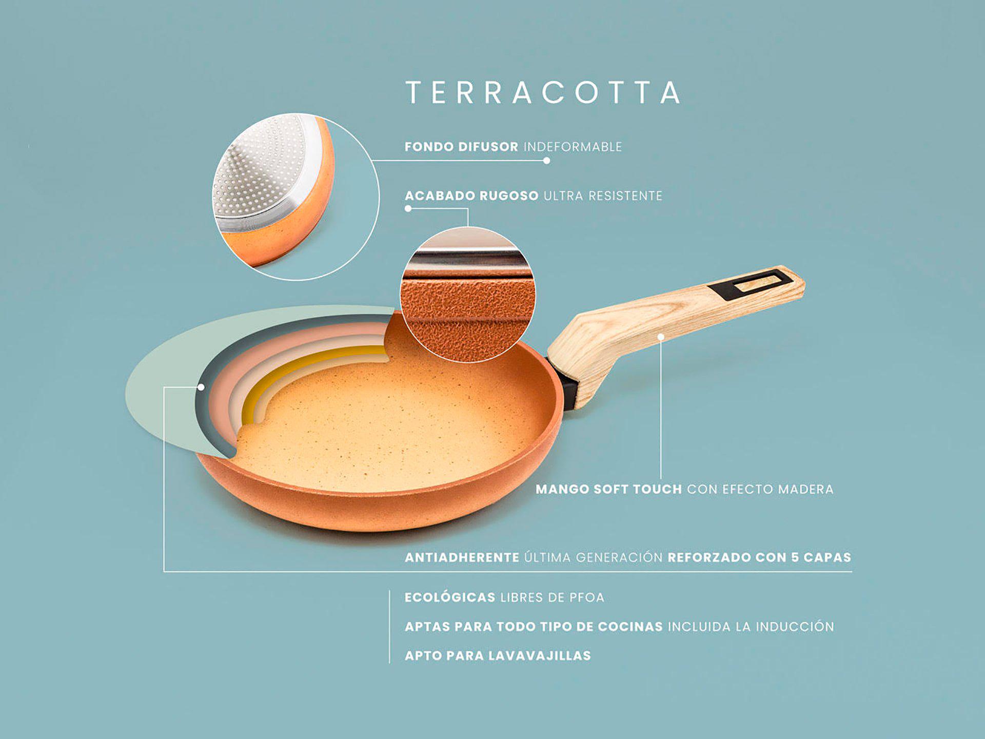 La colección de menaje Terracotta está inspirada en las ollas y vasijas de barro tradicionales. Su sofisticado diseño ofrece un manejo cómodo y suave gracias a sus empuñaduras «soft touch», con un estampado imitación madera. Su base de aluminio de gran grosor brinda una cocción uniforme. Dispones de diferentes tamaños según el diámetro de la cazuela: 16, 20, 24, 28 y 32 cms